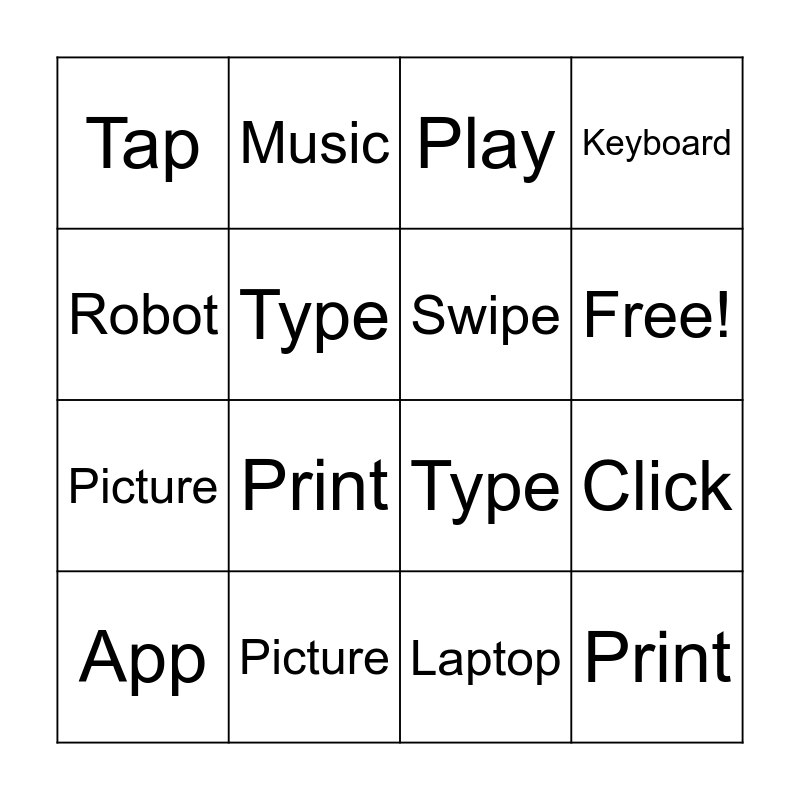 ⚠ This card has duplicate items: Keyboard (2), Mouse (2), Screen (2), Camera (2), Game (2), App (2), Music (2), Video (2), Drawing (2), Computer (2), iPad (2), Laptop (2), Robot (2), Printer (2), Type (2), Click (2), Tap (2), Speak (2), Picture (2), Sound (2), Print (2)