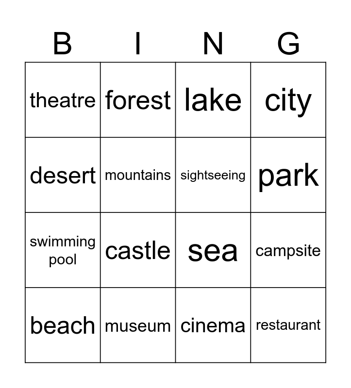 This bingo card has 16 words: beach, museum, lake, city, desert, forest, sea, campsite, theatre, mountains, cinema, park, swimming pool, castle, sightseeing and restaurant.