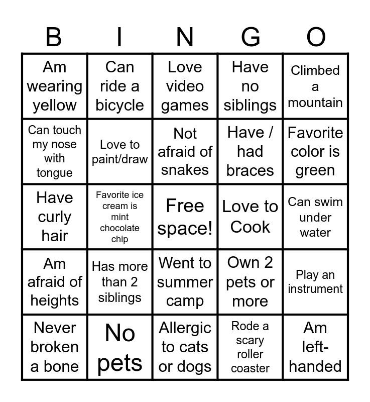 This bingo card has a free space and 24 words: Has more than 2 siblings, No pets, Not afraid of snakes, Never broken a bone, Climbed a mountain, Am wearing yellow, Can touch my nose with tongue, Can ride a bicycle, Love to Cook, Went to summer camp, Have / had braces, Have curly hair, Own 2 pets or more, Play an instrument, Love to paint/draw, Rode a scary roller coaster, Can swim under water, Love video games, Favorite color is green, Favorite ice cream is mint chocolate chip, Am left-handed, Am afraid of heights, Have no siblings and Allergic to cats or dogs.