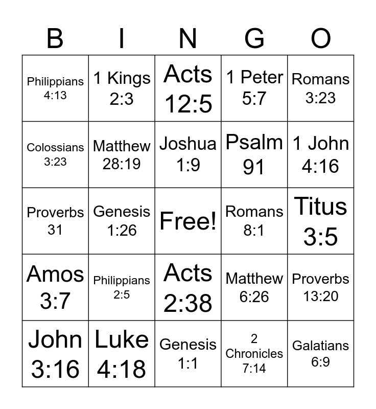 This bingo card has a free space and 57 words: Psalm 23, John 3:16, Jeremiah 29:11, Philippians 4:13, Genesis 1:1, Romans 8:28, Matthew 28:19, Exodus 10, Psalm 91, Isaiah 41:10, 1 Peter 5:7, Matthew 11:28, Galatians 5:22, Ephesians 2:10, Ephesians 3:20, Hebrews 11:1, Romans 3:23, Genesis 1:26, James 1:12, Galatians 6:9, Romans 8:1, Ephesians 6, Matthew 6:26, Acts 12:5, Ecclesiastes 3:4, Joshua 1:9, Numbers 6:24, Proverbs 3:5, 1 John 4:16, 2 Corinthians 5:17, 1 Thessalonians 5:18, John 1:1, 2 Timothy 3:16, Mark 16:15, Titus 3:5, Colossians 3:23, Micah 6:8, Proverbs 31, Jonah 1:16, Amos 3:7, 1 Kings 2:3, Acts 2:38, Mark 12:30, Acts 4:12, Titus 2:11,, John 14:1,, Philippians 2:5, Luke 4:18, Hebrews 4:16, Deuteronomy 7:9, Psalms 86:15, 2 Chronicles 7:14, Revelation 21:4, Zephaniah 3:17, 2 Peter 3:9, Proverbs 13:20 and Luke 6:38.