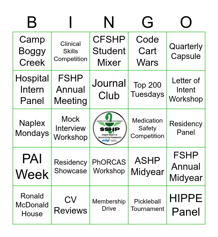This bingo card has a free space and 24 words: Residency Showcase, CV Reviews, Journal Club, Ronald McDonald House, Quarterly Capsule, Camp Boggy Creek, Hospital Intern Panel, Clinical Skills Competition, Medication Safety Competition, PhORCAS Workshop, Top 200 Tuesdays, Naplex Mondays, ASHP Midyear, FSHP Annual Midyear, FSHP Annual Meeting, Pickleball Tournament, Residency Panel, CFSHP Student Mixer, Letter of Intent Workshop, Mock Interview Workshop, HIPPE Panel, PAI Week, Code Cart Wars and Membership Drive.