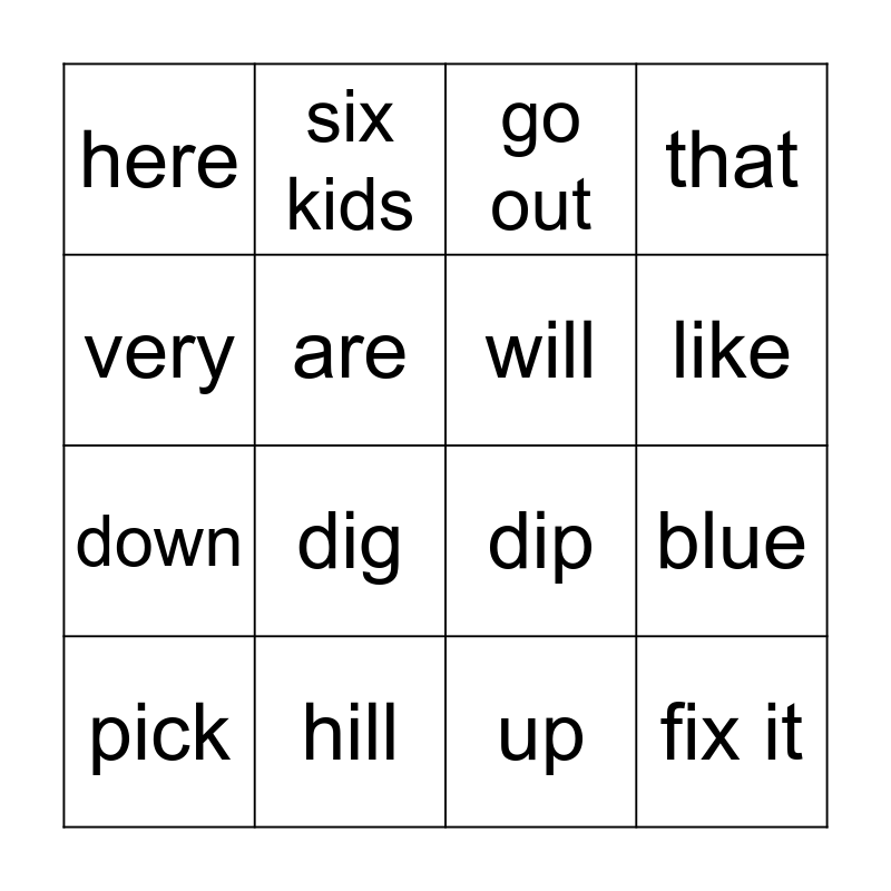 This bingo card has 16 words: hill, blue, go out, here, down, six kids, dip, up, very, are, pick, that, dig, like, will and fix it.