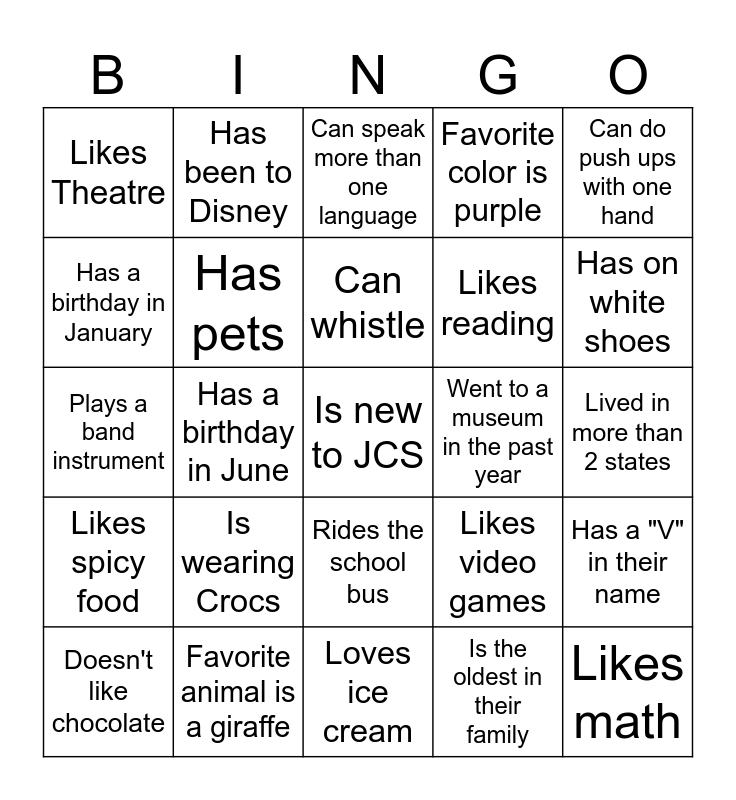 This bingo card has a free space and 24 words: Is wearing Crocs, Favorite animal is a giraffe, Can whistle, Doesn't like chocolate, Can do push ups with one hand, Likes Theatre, Has a birthday in January, Has been to Disney, Went to a museum in the past year, Rides the school bus, Likes reading, Plays a band instrument, Likes video games, Has a "V" in their name, Has pets, Is the oldest in their family, Lived in more than 2 states, Can speak more than one language, Has on white shoes, Has a birthday in June, Likes math, Likes spicy food, Favorite color is purple and Loves ice cream.