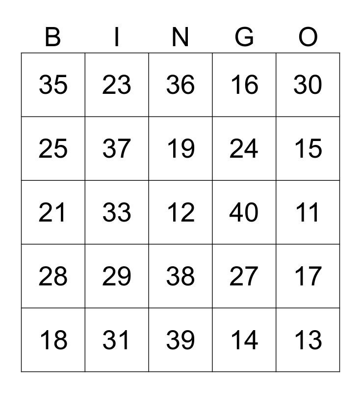 This bingo card has 30 words: 31, 32, 33, 34, 35, 36, 37, 38, 40, 39, 11, 12, 14, 13, 15, 26, 27, 28, 29, 30, 21, 22, 23, 24, 25, 16, 17, 18, 19 and 20.