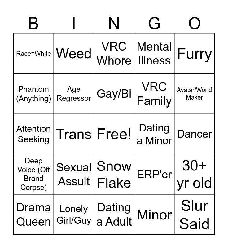 This bingo card has a free space and 24 words: Sexual Assult, Lonely Girl/Guy, Gay/Bi, Drama Queen, Furry, Race=White, Phantom (Anything), Weed, Dating a Minor, Snow Flake, VRC Family, Attention Seeking, ERP'er, 30+ yr old, Age Regressor, Minor, Dancer, VRC Whore, Avatar/World Maker, Trans, Slur Said, Deep Voice (Off Brand Corpse), Mental Illness and Dating a Adult.