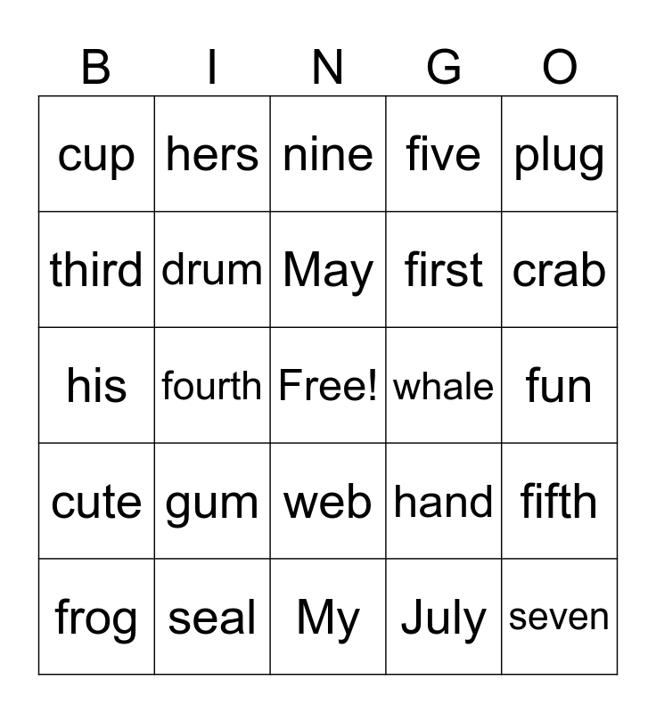 This bingo card has a free space and 34 words: party, July, name, shark, cute, drum, plug, frog, hers, eight, May, nine, three, scary, whale, crab, seal, his, gum, hand, web, April, cup, fun, My, seven, five, map, first, third, second, fourth, fifth and water.