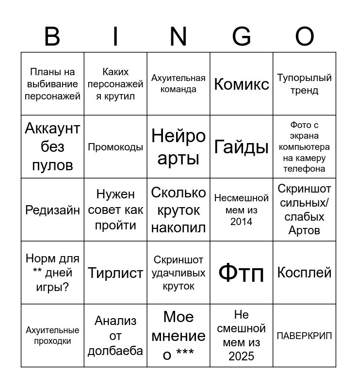 This bingo card has a free space and 24 words: Тирлист, Анализ от долбаеба, Нейро арты, Ахуительные проходки, Тупорылый тренд, Планы на выбивание персонажей, Аккаунт без пулов, Каких персонажей я крутил, Несмешной мем из 2014, Скриншот удачливых круток, Гайды, Редизайн, Фтп, Косплей, Промокоды, Не смешной мем из 2025, Скриншот сильных/слабых Артов, Ахуительная команда, Фото с экрана компьютера на камеру телефона, Нужен совет как пройти, ПАВЕРКРИП, Норм для ** дней игры?, Комикс and Мое мнение о ***.