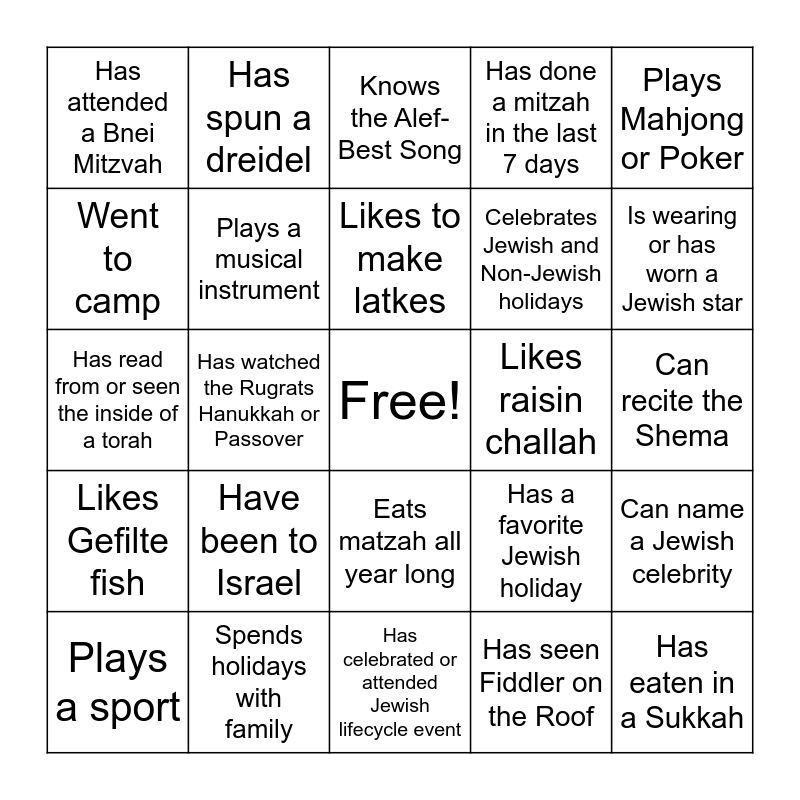 This bingo card has a free space and 24 words: Have been to Israel, Spends holidays with family, Likes to make latkes, Plays a sport, Plays Mahjong or Poker, Has attended a Bnei Mitzvah, Went to camp, Has spun a dreidel, Likes raisin challah, Eats matzah all year long, Celebrates Jewish and Non-Jewish holidays, Has read from or seen the inside of a torah, Has a favorite Jewish holiday, Can name a Jewish celebrity, Plays a musical instrument, Has seen Fiddler on the Roof, Can recite the Shema, Knows the Alef-Best Song, Is wearing or has worn a Jewish star, Has watched the Rugrats Hanukkah or Passover, Has eaten in a Sukkah, Likes Gefilte fish, Has done a mitzah in the last 7 days and Has celebrated or attended Jewish lifecycle event.