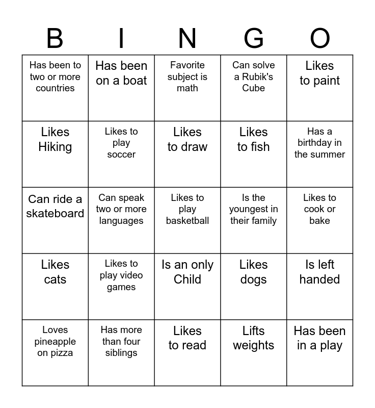 This bingo card has 30 words: Has more than four siblings, Can play a musical instrument, Can speak two or more languages, Has more than three pets, Has been to two or more countries, Favorite subject is math, Likes to play soccer, Is an only Child, Is the youngest in their family, Likes to read, Likes to cook or bake, Likes to play basketball, Lifts weights, Has been in a play, Has a birthday in the summer, Likes to swim, Likes dogs, Likes cats, Likes to play video games, Likes to paint, Can ride a skateboard, Has a pet other than a cat or a dog, Has been on a boat, Likes to fish, Likes Hiking, Can solve a Rubik's Cube, Is left handed, Loves pineapple on pizza, Likes to draw and Has been on a plane.