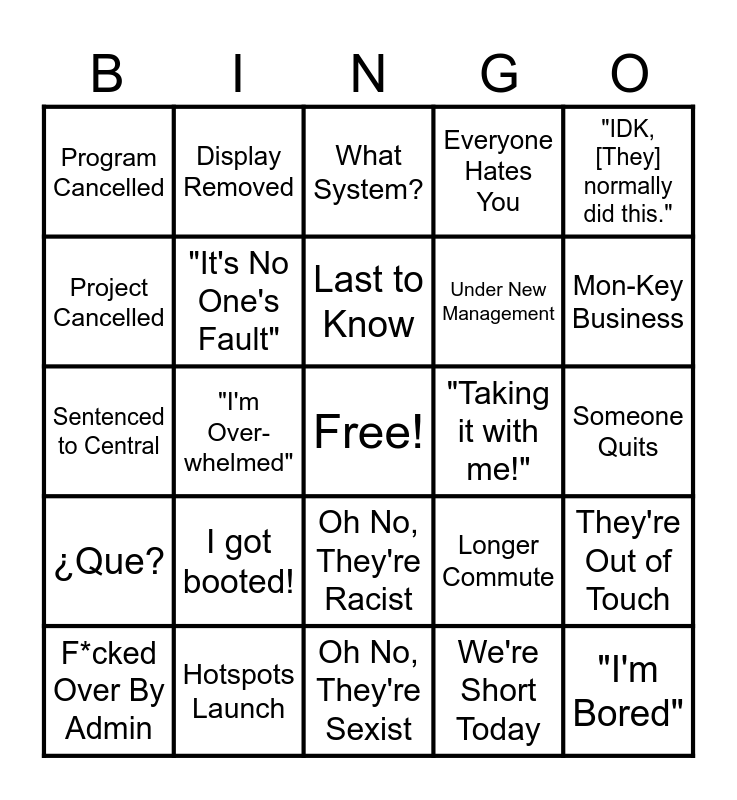 This bingo card has a free space and 24 words: I got booted!, Hotspots Launch, Last to Know, F*cked Over By Admin, "IDK, [They] normally did this.", Program Cancelled, Project Cancelled, Display Removed, "Taking it with me!", Oh No, They're Racist, Under New Management, Sentenced to Central, Longer Commute, They're Out of Touch, "It's No One's Fault", We're Short Today, Someone Quits, What System?, Mon-Key Business, "I'm Over-whelmed", "I'm Bored", ¿Que?, Everyone Hates You and Oh No, They're Sexist.