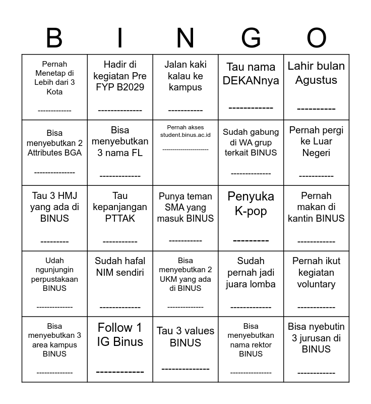 This bingo card has a free space and 24 words: Sudah hafal NIM sendiri -------------, Follow 1 IG Binus ------------, Pernah akses student.binus.ac.id -----------------------, Bisa menyebutkan 3 area kampus BINUS --------------, Lahir bulan Agustus ----------, Pernah Menetap di Lebih dari 3 Kota -------------, Bisa menyebutkan 2 Attributes BGA ---------------, Hadir di kegiatan Pre FYP B2029 --------------, Penyuka K-pop ---------, Bisa menyebutkan 2 UKM yang ada di BINUS --------------, Sudah gabung di WA grup terkait BINUS --------------, Tau 3 HMJ yang ada di BINUS ---------, Sudah pernah jadi juara lomba -------------, Pernah ikut kegiatan voluntary ------------, Bisa menyebutkan 3 nama FL -------------, Bisa menyebutkan nama rektor BINUS ----------------, Pernah makan di kantin BINUS ------------, Jalan kaki kalau ke kampus -----------, Pernah pergi ke Luar Negeri -----------, Tau kepanjangan PTTAK -----------, Bisa nyebutin 3 jurusan di BINUS ------------, Udah ngunjungin perpustakaan BINUS --------------, Tau nama DEKANnya ------------ and Tau 3 values BINUS --------------.