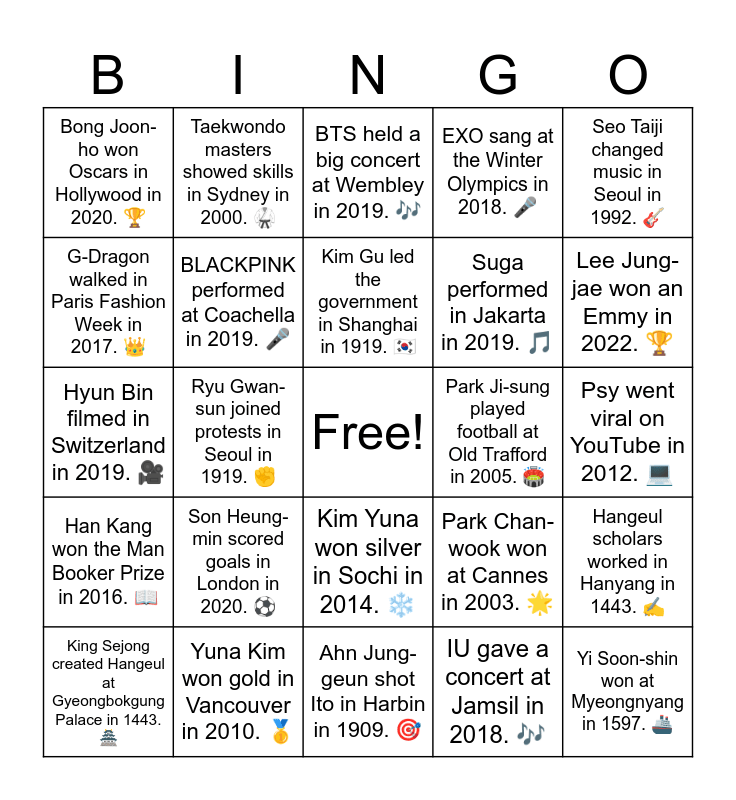 This bingo card has a free space and 29 words: King Sejong created Hangeul at Gyeongbokgung Palace in 1443. 🏯, Admiral Yi won a battle at Hansando in 1592. ⚔️, Ryu Gwan-sun joined protests in Seoul in 1919. ✊, Kim Dae-jung won the Nobel Prize in Oslo in 2000. 🕊️, Bong Joon-ho won Oscars in Hollywood in 2020. 🏆, BTS held a big concert at Wembley in 2019. 🎶, BLACKPINK performed at Coachella in 2019. 🎤, Son Heung-min scored goals in London in 2020. ⚽, Park Ji-sung played football at Old Trafford in 2005. 🏟️, Yuna Kim won gold in Vancouver in 2010. 🥇, Psy went viral on YouTube in 2012. 💻, Yi Soon-shin won at Myeongnyang in 1597. 🚢, Ahn Jung-geun shot Ito in Harbin in 1909. 🎯, IU gave a concert at Jamsil in 2018. 🎶, Lee Jung-jae won an Emmy in 2022. 🏆, Rain performed at Madison Square Garden in 2006. 🌍, Kim Yuna won silver in Sochi in 2014. ❄️, Han Kang won the Man Booker Prize in 2016. 📖, Seo Taiji changed music in Seoul in 1992. 🎸, Hyun Bin filmed in Switzerland in 2019. 🎥, Park Chan-wook won at Cannes in 2003. 🌟, Jungkook sang at the World Cup in 2018. 🌏, Suga performed in Jakarta in 2019. 🎵, G-Dragon walked in Paris Fashion Week in 2017. 👑, EXO sang at the Winter Olympics in 2018. 🎤, Taekwondo masters showed skills in Sydney in 2000. 🥋, Hangeul scholars worked in Hanyang in 1443. ✍️, Kim Gu led the government in Shanghai in 1919. 🇰🇷 and Lee Byung-hun acted in Hollywood in 2008. 🎥.