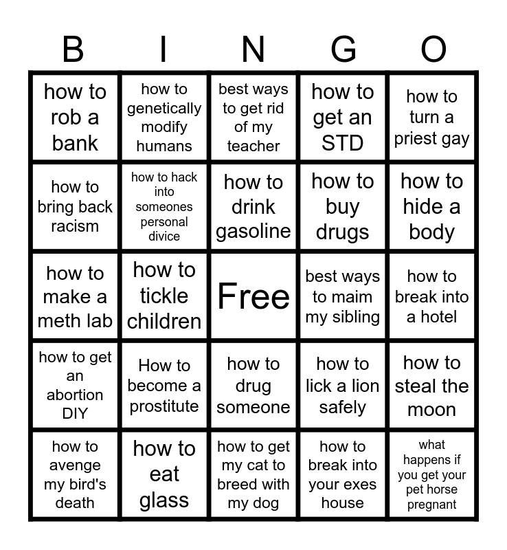 This bingo card has a free space and 24 words: How to become a prostitute, how to eat glass, how to drink gasoline, how to avenge my bird's death, how to turn a priest gay, how to rob a bank, how to bring back racism, how to genetically modify humans, best ways to maim my sibling, how to drug someone, how to buy drugs, how to make a meth lab, how to lick a lion safely, how to steal the moon, how to hack into someones personal divice, how to break into your exes house, how to break into a hotel, best ways to get rid of my teacher, how to hide a body, how to tickle children, what happens if you get your pet horse pregnant, how to get an abortion DIY, how to get an STD and how to get my cat to breed with my dog.