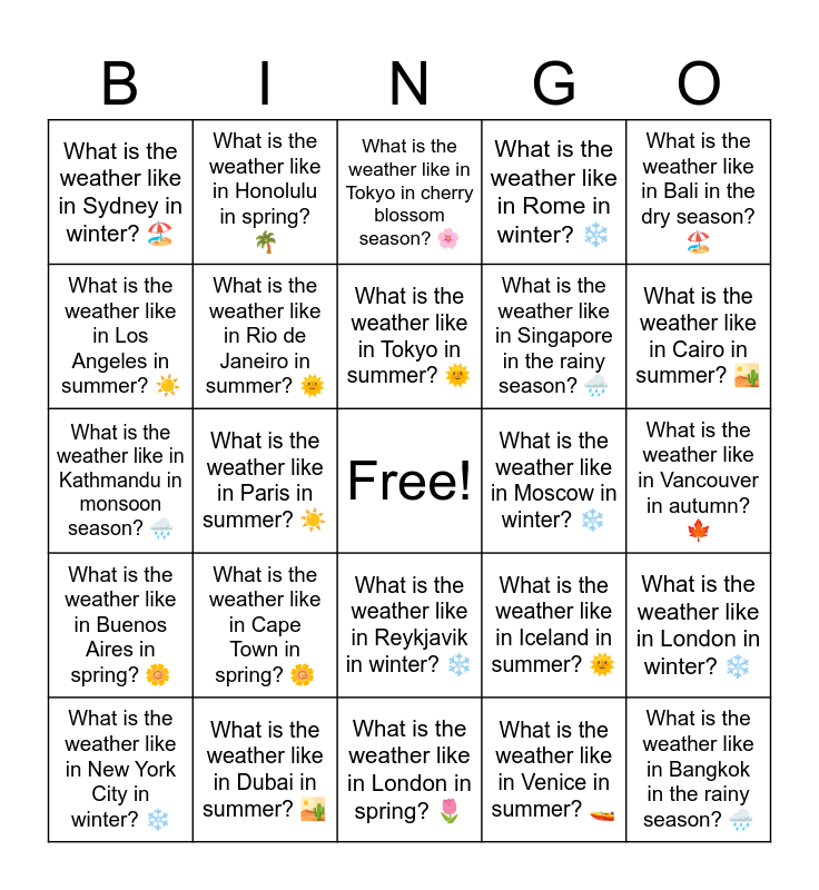This bingo card has a free space and 29 words: What is the weather like in New York City in winter? βοΈ, What is the weather like in Seoul in spring? πΈ, What is the weather like in Paris in summer? βοΈ, What is the weather like in London in autumn? π, What is the weather like in Sydney in winter? ποΈ, What is the weather like in Tokyo in cherry blossom season? πΈ, What is the weather like in Rio de Janeiro in summer? π, What is the weather like in Cape Town in spring? πΌ, What is the weather like in Moscow in winter? βοΈ, What is the weather like in Dubai in summer? ποΈ, What is the weather like in Vancouver in autumn? π, What is the weather like in Bangkok in the rainy season? π§οΈ, What is the weather like in London in spring? π·, What is the weather like in Venice in summer? π€, What is the weather like in Cairo in summer? ποΈ, What is the weather like in San Francisco in autumn? π, What is the weather like in Reykjavik in winter? βοΈ, What is the weather like in Buenos Aires in spring? πΌ, What is the weather like in Bali in the dry season? ποΈ, What is the weather like in Kathmandu in monsoon season? π§οΈ, What is the weather like in Iceland in summer? π, What is the weather like in Marrakech in spring? πΈ, What is the weather like in Singapore in the rainy season? π§οΈ, What is the weather like in Los Angeles in summer? βοΈ, What is the weather like in Rome in winter? βοΈ, What is the weather like in Honolulu in spring? π΄, What is the weather like in London in winter? βοΈ, What is the weather like in Tokyo in summer? π and What is the weather like in Patagonia in autumn? π.