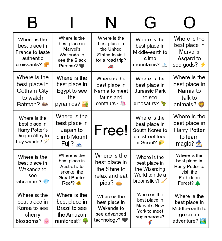 This bingo card has a free space and 29 words: Where is the best place in Korea to see cherry blossoms? ๐ธ, Where is the best place in the world to watch the northern lights? ๐, Where is the best place in Japan to climb Mount Fuji? ๐ป, Where is the best place in Italy to see the Colosseum? ๐๏ธ, Where is the best place in France to taste authentic croissants? ๐ฅ, Where is the best place in the United States to visit for a road trip? ๐, Where is the best place in Egypt to see the pyramids? ๐๏ธ, Where is the best place in Australia to snorkel the Great Barrier Reef? ๐ , Where is the best place in South Korea to eat street food in Seoul? ๐ฎ, Where is the best place in Brazil to see the Amazon rainforest? ๐ณ, Where is the best place in Harry Potter to learn magic? ๐งโโ๏ธ, Where is the best place in Middle-earth to go on an adventure? ๐๏ธ, Where is the best place in Wakanda to see advanced technology? ๐ค, Where is the best place in Marvelโs New York to meet superheroes? ๐ฆธโโ๏ธ, Where is the best place in Narnia to talk to animals? ๐ฆ, Where is the best place in Hogwarts to have fun with friends? ๐ฐ, Where is the best place in the Shire to relax and eat pies? ๐ฅง, Where is the best place in Wakanda to see vibranium? ๐, Where is the best place in Marvelโs Asgard to see gods? โก, Where is the best place in Harry Potterโs Diagon Alley to buy wands? ๐ช, Where is the best place in the Wizarding World to ride a broomstick? ๐งน, Where is the best place in Pandora (Avatar) to see floating mountains? ๐, Where is the best place in Jurassic Park to see dinosaurs? ๐ฆ, Where is the best place in Gotham City to watch Batman? ๐ฆ, Where is the best place in Middle-earth to climb mountains? ๐๏ธ, Where is the best place in Marvelโs Wakanda to see the Black Panther? ๐ค, Where is the best place in Harry Potter to visit the Forbidden Forest? ๐ฒ, Where is the best place in Narnia to meet fauns and centaurs? ๐ฆ and Where is the best place in Hogwarts to explore secret passages? ๐ฐ.