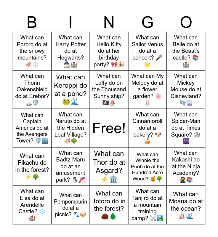This bingo card has a free space and 29 words: What can Elsa do at Arendelle Castle? βοΈπ°, What can Iron Man do at Stark Tower? π¦ΎποΈ, What can Naruto do at the Hidden Leaf Village? ππ³, What can Doraemon do at Nobitaβs house? π€π , What can Pororo do at the snowy mountains? π·βοΈ, What can Hello Kitty do at her birthday party? ππ, What can Keroppi do at a pond? πΈπ, What can Badtz-Maru do at an amusement park? π§π’, What can Cinnamoroll do at a bakery? πΆπ°, What can Pompompurin do at a picnic? πΎπ₯ͺ, What can Spider-Man do at Times Square? πΈοΈπ, What can Moana do at the ocean? β΅π, What can Totoro do in the forest? π°π², What can Tanjiro do at a mountain training camp? βοΈποΈ, What can Mickey Mouse do at Disneyland? π§€π‘, What can Sailor Moon do at the Moon Kingdom? ππ°, What can Thor do at Asgard? β‘ποΈ, What can Pikachu do in the forest? β‘π³, What can Belle do at the Beastβs castle? ππ°, What can Captain America do at the Avengers Tower? π‘οΈποΈ, What can Winnie the Pooh do at the Hundred Acre Wood? π―π³, What can Gudetama do at a kitchen? π₯π³, What can My Melody do at a flower garden? πΈπ°, What can Thorin Oakenshield do at Erebor? ποΈπ‘οΈ, What can Sailor Venus do at a concert? π€π, What can Harry Potter do at Hogwarts? π§ββοΈπ°, What can Kakashi do at the Ninja Academy? π₯·π, What can Luffy do on the Thousand Sunny ship? π΄ββ οΈβ΅ and What can Black Panther do in Wakanda? π€π.