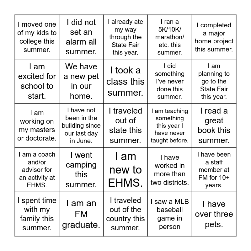 This bingo card has 25 words: I went camping this summer., I traveled out of the country this summer., I took a class this summer., I spent time with my family this summer., I completed a major home project this summer., I moved one of my kids to college this summer., I am excited for school to start., I did not set an alarm all summer., I am teaching something this year I have never taught before., I am new to EHMS., I did something I've never done this summer., I am working on my masters or doctorate., I have worked in more than two districts., I have been a staff member at FM for 10+ years., We have a new pet in our home., I have over three pets., I read a great book this summer., I already ate my way through the State Fair this year., I am planning to go to the State Fair this year., I have not been in the building since our last day in June., I traveled out of state this summer., I am an FM graduate., I am a coach and/or advisor for an activity at EHMS., I ran a 5K/10K/ marathon/ etc. this summer. and I saw a MLB baseball game in person.