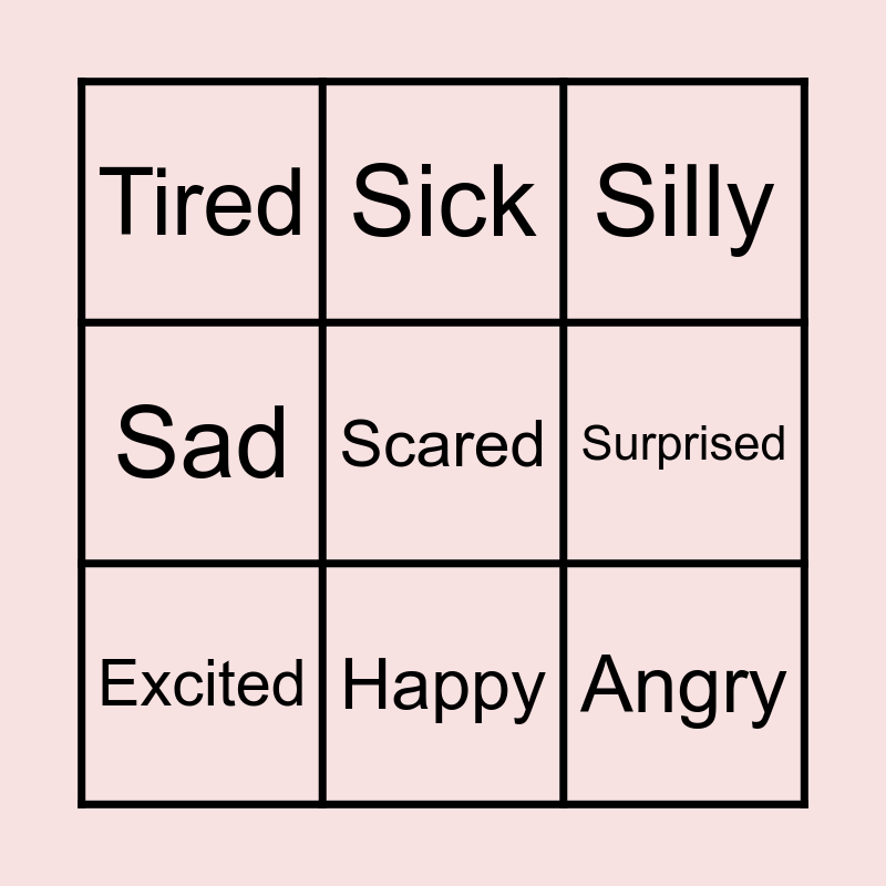 This bingo card has a free space and 8 words: Surprised, Silly, Sick, Excited, Tired, Angry, Sad and Happy.