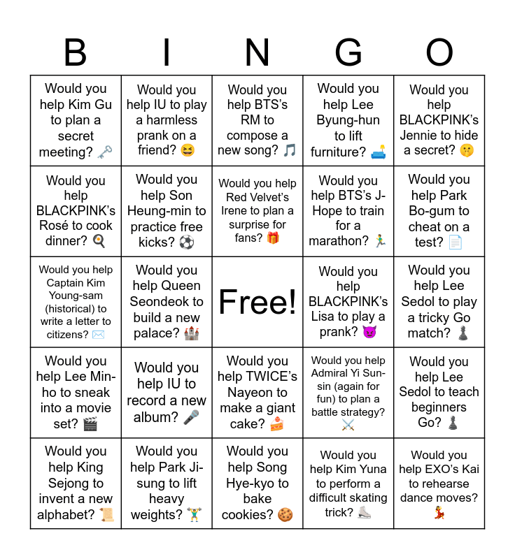 This bingo card has a free space and 29 words: Would you help King Sejong to invent a new alphabet? 📜, Would you help Admiral Yi Sun-sin to repair his warships? ⚓, Would you help Queen Seondeok to build a new palace? 🏰, Would you help Yi I (Yulgok) to write a philosophical essay? ✍️, Would you help Kim Gu to plan a secret meeting? 🗝️, Would you help BTS’s RM to compose a new song? 🎵, Would you help Son Heung-min to practice free kicks? ⚽, Would you help IU to record a new album? 🎤, Would you help BLACKPINK’s Lisa to play a prank? 😈, Would you help Park Ji-sung to lift heavy weights? 🏋️♂️, Would you help Lee Sedol to play a tricky Go match? ♟️, Would you help EXO’s Kai to rehearse dance moves? 💃, Would you help Song Hye-kyo to bake cookies? 🍪, Would you help Kim Yuna to perform a difficult skating trick? ⛸️, Would you help Park Bo-gum to cheat on a test? 📄, Would you help Seventeen’s Joshua to develop a new app? 📱, Would you help TWICE’s Nayeon to make a giant cake? 🍰, Would you help Lee Min-ho to sneak into a movie set? 🎬, Would you help BLACKPINK’s Jennie to hide a secret? 🤫, Would you help Captain Kim Young-sam (historical) to write a letter to citizens? ✉️, Would you help Admiral Yi Sun-sin (again for fun) to plan a battle strategy? ⚔️, Would you help GOT7’s Jackson to sneak into a concert? 🎤, Would you help BTS’s J-Hope to train for a marathon? 🏃♂️, Would you help BLACKPINK’s Rosé to cook dinner? 🍳, Would you help Lee Byung-hun to lift furniture? 🛋️, Would you help IU to play a harmless prank on a friend? 😆, Would you help Lee Sedol to teach beginners Go? ♟️, Would you help Red Velvet’s Irene to plan a surprise for fans? 🎁 and Would you help Son Heung-min to organize a charity match? ⚽.