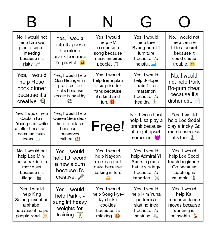 This bingo card has a free space and 29 words: Yes, I would help King Sejong invent an alphabet because it helps people read. π, Yes, I would help Admiral Yi Sun-sin repair his warships to protect the country. β, Yes, I would help Queen Seondeok build a palace because it preserves culture. π°, Yes, I would help Yi I write a philosophical essay because learning is valuable. βοΈ, No, I would not help Kim Gu plan a secret meeting because itβs risky. ποΈ, Yes, I would help RM compose a song because music inspires people. π΅, Yes, I would help Son Heung-min practice free kicks because soccer is healthy. β½, Yes, I would help IU record a new album because itβs creative. π€, No, I would not help Lisa play a prank because it might upset someone. π, Yes, I would help Park Ji-sung lift heavy weights for training. ποΈββοΈ, Yes, I would help Lee Sedol play a tricky Go match because itβs fun. βοΈ, Yes, I would help Kai rehearse dance moves because dancing is enjoyable. π, Yes, I would help Song Hye-kyo bake cookies because itβs relaxing. πͺ, Yes, I would help Kim Yuna perform a skating trick because itβs inspiring. βΈοΈ, No, I would not help Park Bo-gum cheat because itβs dishonest. π, Yes, I would help Joshua develop a new app because itβs useful. π±, Yes, I would help Nayeon make a giant cake because baking is fun. π°, No, I would not help Lee Min-ho sneak into a movie set because itβs illegal. π¬, No, I would not help Jennie hide a secret because it could cause trouble. π€«, Yes, I would help Captain Kim Young-sam write a letter because it communicates ideas. βοΈ, Yes, I would help Admiral Yi Sun-sin plan a battle strategy because itβs important. βοΈ, No, I would not help Jackson sneak into a concert because itβs unfair. π€, Yes, I would help J-Hope train for a marathon because itβs healthy. πββοΈ, Yes, I would help RosΓ© cook dinner because itβs creative. π³, Yes, I would help Lee Byung-hun lift furniture because itβs helpful. ποΈ, Yes, I would help IU play a harmless prank because itβs playful. π, Yes, I would help Lee Sedol teach beginners Go because teaching is valuable. βοΈ, Yes, I would help Irene plan a surprise for fans because itβs kind and fun. π and Yes, I would help Son Heung-min organize a charity match because it helps others. β½.