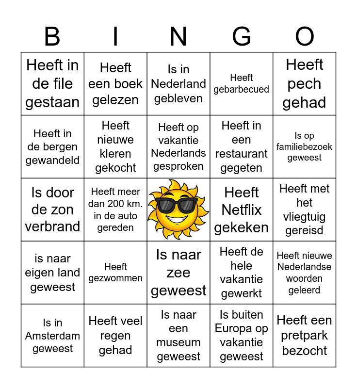 This bingo card has a free space and 24 words: Heeft gezwommen, Heeft veel regen gehad, Heeft op vakantie Nederlands gesproken, Is in Amsterdam geweest, Heeft pech gehad, Heeft in de file gestaan, Heeft in de bergen gewandeld, Heeft een boek gelezen, Heeft Netflix gekeken, Is naar zee geweest, Heeft in een restaurant gegeten, Is door de zon verbrand, Heeft de hele vakantie gewerkt, Heeft nieuwe Nederlandse woorden geleerd, Heeft nieuwe kleren gekocht, Is buiten Europa op vakantie geweest, Heeft met het vliegtuig gereisd, Is in Nederland gebleven, Is op familiebezoek geweest, Heeft meer dan 200 km. in de auto gereden, Heeft een pretpark bezocht, is naar eigen land geweest, Heeft gebarbecued and Is naar een museum geweest.