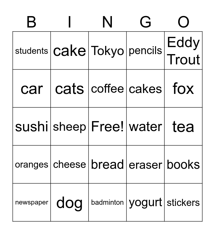 This bingo card has a free space and 41 words: apples, sushi, teachers, cats, dog, bread, coffee, fish, Eddy Trout, oranges, sheep, pencils, stickers, tea, water, cheese, meat, students, Luffy, Tokyo, books, homework, badminton, cakes, Noshiro, papers, yogurt, child, fox, textbook, cookie, cake, newspaper, pencil case, eraser, car, bicycle, shoe, shoes, card and matcha.