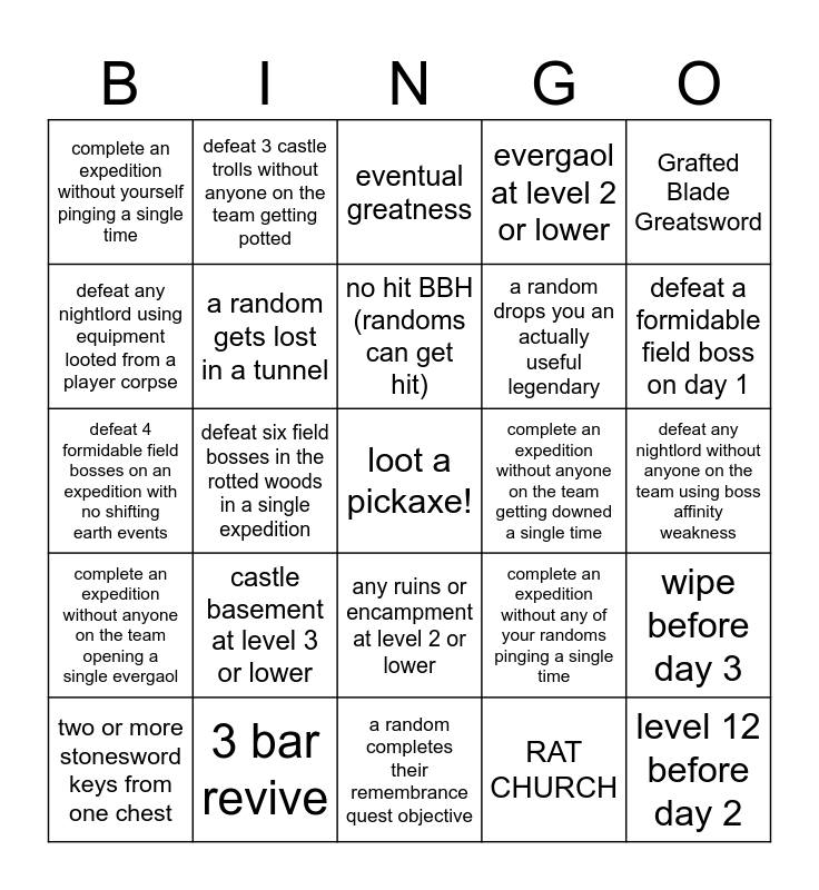 This bingo card has a free space and 24 words: castle basement at level 3 or lower, 3 bar revive, no hit BBH (randoms can get hit), two or more stonesword keys from one chest, Grafted Blade Greatsword, complete an expedition without yourself pinging a single time, defeat any nightlord using equipment looted from a player corpse, defeat 3 castle trolls without anyone on the team getting potted, complete an expedition without anyone on the team getting downed a single time, any ruins or encampment at level 2 or lower, a random drops you an actually useful legendary, defeat 4 formidable field bosses on an expedition with no shifting earth events, complete an expedition without any of your randoms pinging a single time, wipe before day 3, a random gets lost in a tunnel, RAT CHURCH, defeat any nightlord without anyone on the team using boss affinity weakness, eventual greatness, defeat a formidable field boss on day 1, defeat six field bosses in the rotted woods in a single expedition, level 12 before day 2, complete an expedition without anyone on the team opening a single evergaol, evergaol at level 2 or lower and a random completes their remembrance quest objective.