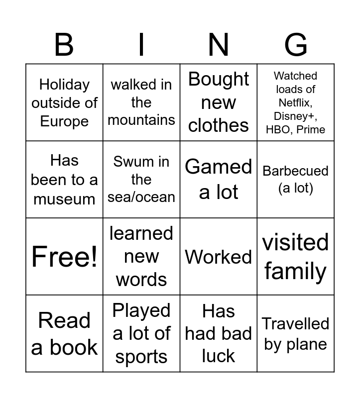 This bingo card has 20 words: visited family, had gotten a sunburn, Bought new clothes, Been to an amusement park, Read a book, Has been to a museum, Played a lot of sports, Holiday outside of Europe, Free!, walked in the mountains, learned new words, Worked, Swum in the sea/ocean, Travelled by plane, Gamed a lot, Stayed in the Netherlands, Barbecued (a lot), Watched loads of Netflix, Disney+, HBO, Prime, Has had bad luck and Has eaten strange food.
