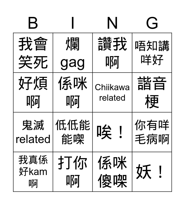 This bingo card has 16 words: 打你啊, 你有咩毛病啊, 讚我啊, 我會笑死, 鬼滅related, 爛gag, 唉!, 係咪傻㗎, 好煩啊, 係咪啊, 我真係好kam 啊, 唔知講咩好, 低低能能㗎, 諧音梗, Chiikawa related and 妖!.