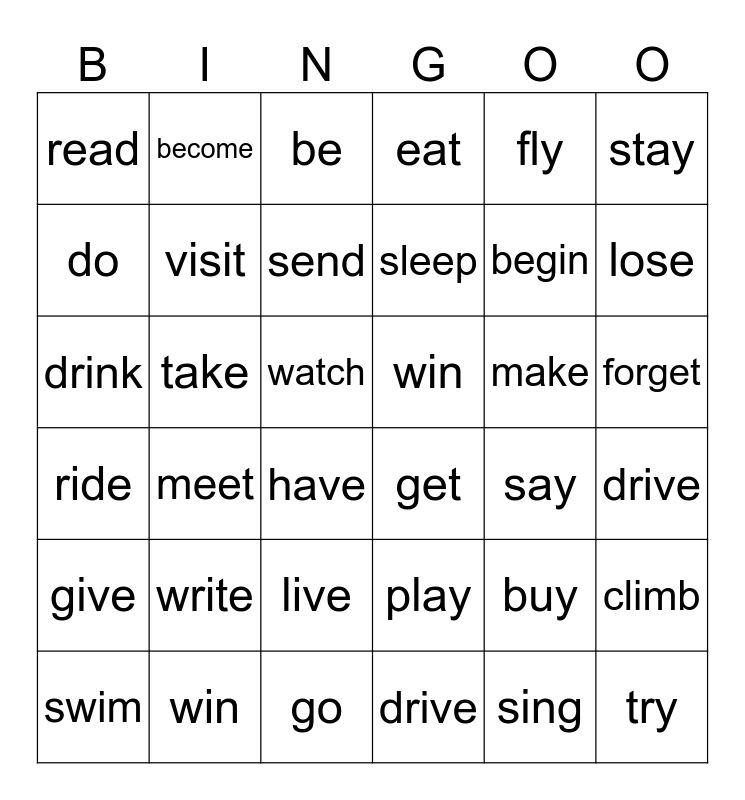 This bingo card has 36 words: play, live, drive, do, ride, win, visit, go, fly, buy, lose, eat, climb, take, sleep, read, give, make, drink, be, watch, meet, get, have, say, become, begin, win, send, stay, try, swim, drive, forget, write and sing.