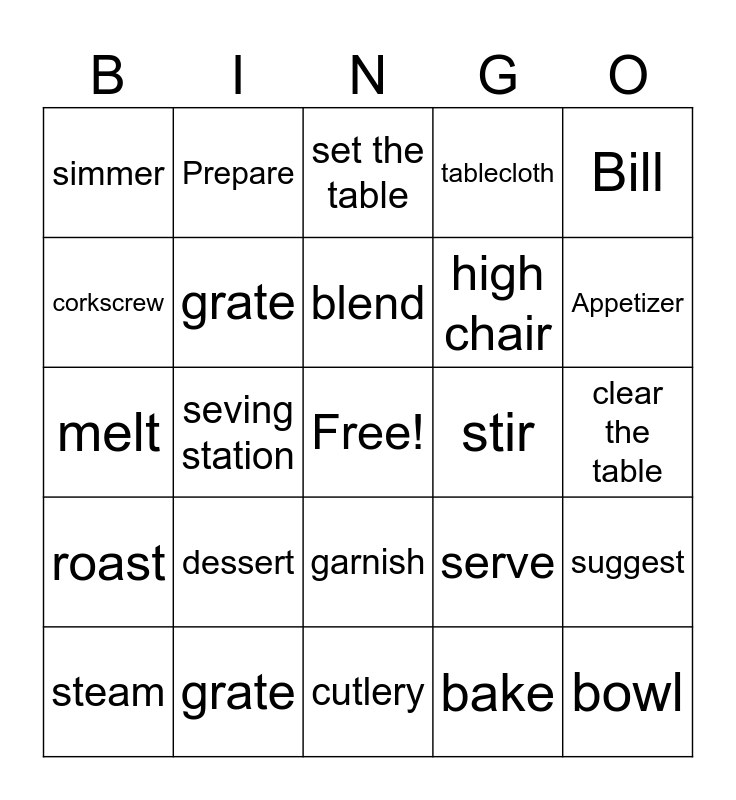 This bingo card has a free space and 34 words: fry, bake, boil, grill, roast, grate, Bill, steam, Prepare, pour, blend, set the table, cut, chop, stir, Appetizer, grate, melt, dessert, serve, garnish, Main dish, simmer, clear the table, cutlery, bowl, tablecloth, pitcher, high chair, corkscrew, serving spoon, seving station, suggest and Apologize.