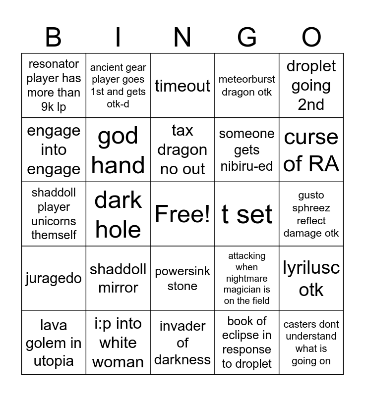 This bingo card has a free space and 24 words: shaddoll mirror, i:p into white woman, tax dragon no out, lava golem in utopia, droplet going 2nd, resonator player has more than 9k lp, engage into engage, ancient gear player goes 1st and gets otk-d, t set, powersink stone, someone gets nibiru-ed, shaddoll player unicorns themself, attacking when nightmare magician is on the field, lyrilusc otk, god hand, book of eclipse in response to droplet, gusto sphreez reflect damage otk, timeout, curse of RA, dark hole, casters dont understand what is going on, juragedo, meteorburst dragon otk and invader of darkness.