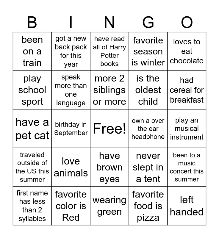 This bingo card has a free space and 24 words: love animals, favorite color is Red, more 2 siblings or more, first name has less than 2 syllables, loves to eat chocolate, been on a train, play school sport, got a new back pack for this year, own a over the ear headphone, have brown eyes, is the oldest child, have a pet cat, never slept in a tent, been to a music concert this summer, speak more than one language, favorite food is pizza, play an musical instrument, have read all of Harry Potter books, had cereal for breakfast, birthday in September, left handed, traveled outside of the US this summer, favorite season is winter and wearing green.