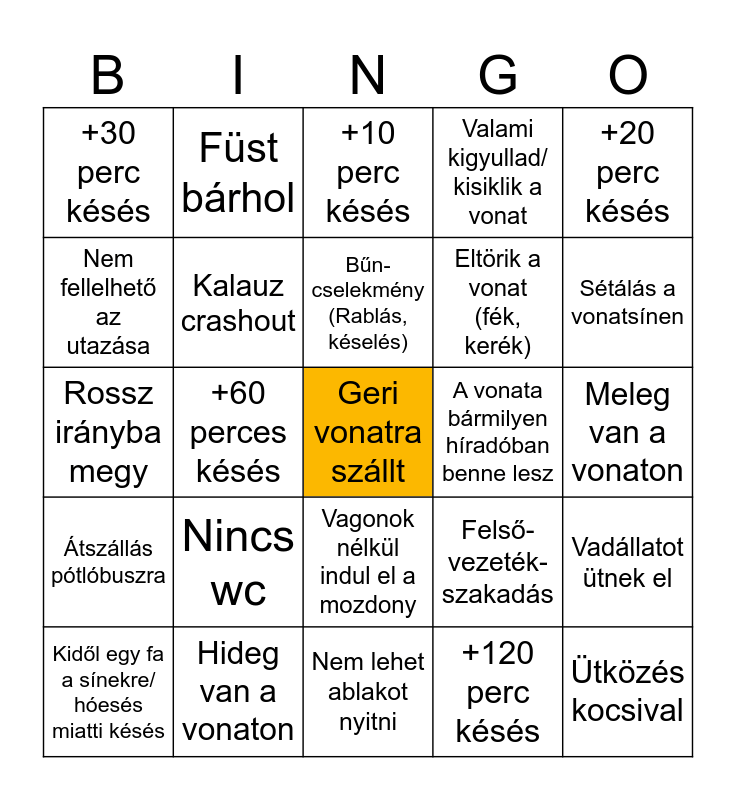 This bingo card has a free space and 24 words: Nincs wc, Hideg van a vonaton, Bűn- cselekmény (Rablás, késelés), Kidől egy fa a sínekre/ hóesés miatti késés, +20 perc késés, +30 perc késés, Nem fellelhető az utazása, Füst bárhol, A vonata bármilyen híradóban benne lesz, Vagonok nélkül indul el a mozdony, Eltörik a vonat (fék, kerék), Rossz irányba megy, Felső- vezeték- szakadás, Vadállatot ütnek el, Kalauz crashout, +120 perc késés, Meleg van a vonaton, +10 perc késés, Sétálás a vonatsínen, +60 perces késés, Ütközés kocsival, Átszállás pótlóbuszra, Valami kigyullad/ kisiklik a vonat and Nem lehet ablakot nyitni.