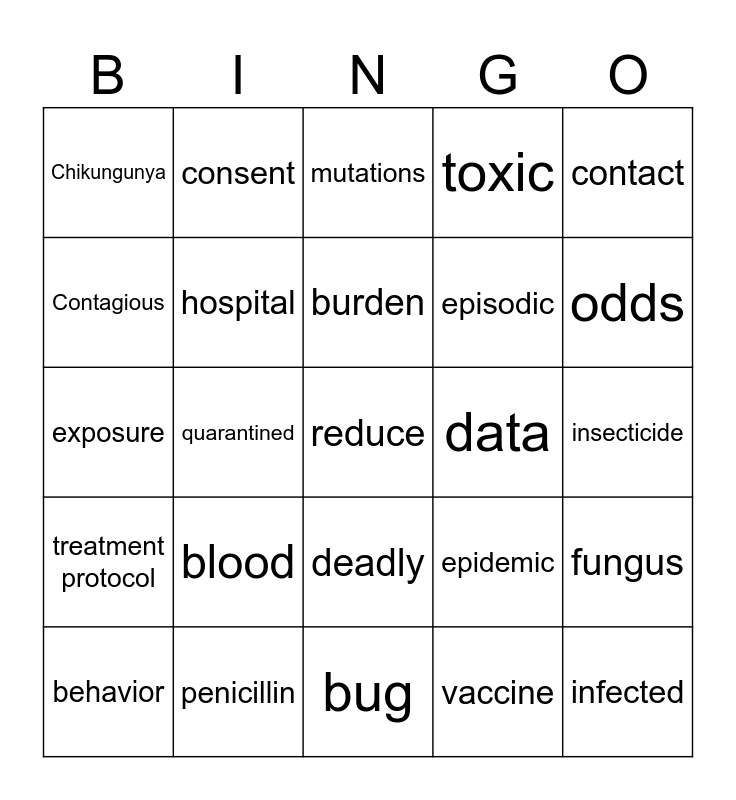 This bingo card has 25 words: blood, bug, burden, behavior, contact, Chikungunya, Contagious, consent, data, deadly, episodic, exposure, epidemic, fungus, hospital, infected, insecticide, mutations, odds, quarantined, reduce, penicillin, treatment protocol, toxic and vaccine.