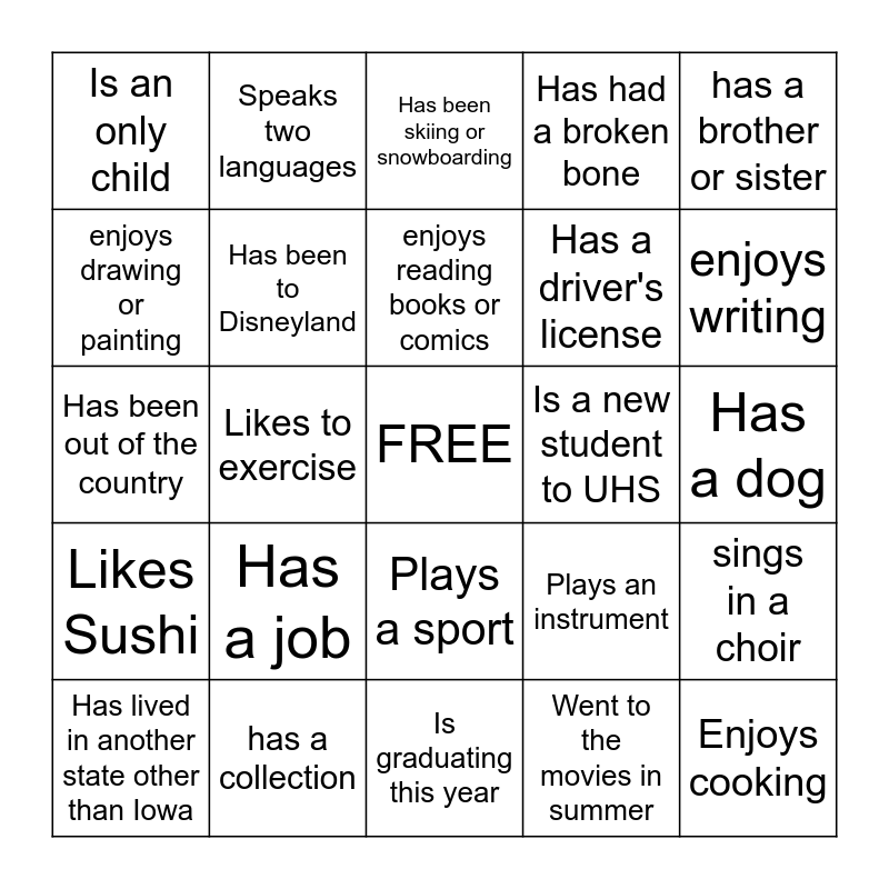 This bingo card has a free space and 24 words: Has a job, has a collection, enjoys reading books or comics, Has lived in another state other than Iowa, has a brother or sister, Is an only child, enjoys drawing or painting, Speaks two languages, Is a new student to UHS, Plays a sport, Has a driver's license, Has been out of the country, Plays an instrument, sings in a choir, Has been to Disneyland, Went to the movies in summer, Has a dog, Has been skiing or snowboarding, enjoys writing, Likes to exercise, Enjoys cooking, Likes Sushi, Has had a broken bone and Is graduating this year.