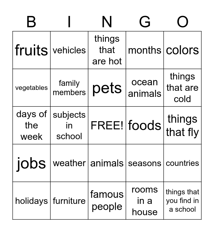 This bingo card has a free space and 24 words: weather, furniture, pets, holidays, colors, fruits, vegetables, vehicles, foods, animals, ocean animals, days of the week, seasons, countries, family members, rooms in a house, things that fly, things that are hot, things that are cold, subjects in school, things that you find in a school, jobs, months and famous people.