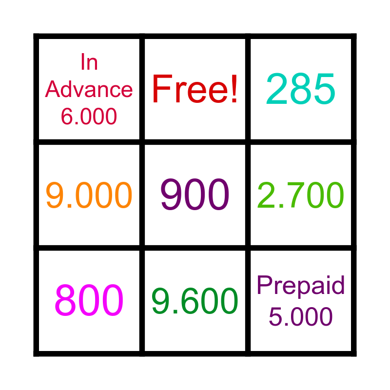 This bingo card has 9 words: 800, 900, 285, In Advance 6.000, Free!, 2.700, 9.000, 9.600 and Prepaid 5.000.