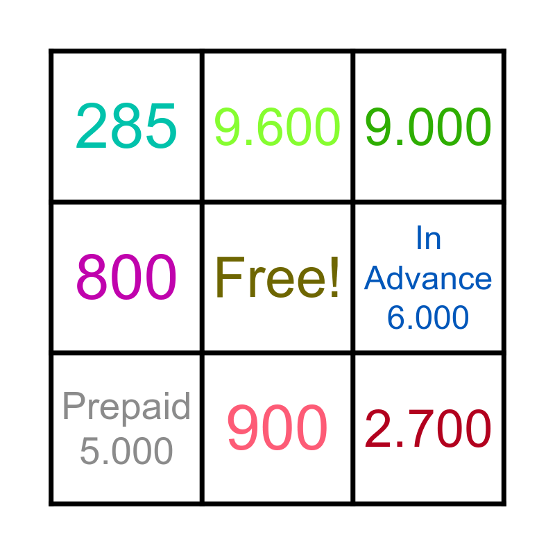 This bingo card has 9 words: Prepaid 5.000, Free!, 9.000, 285, 9.600, In Advance 6.000, 800, 900 and 2.700.