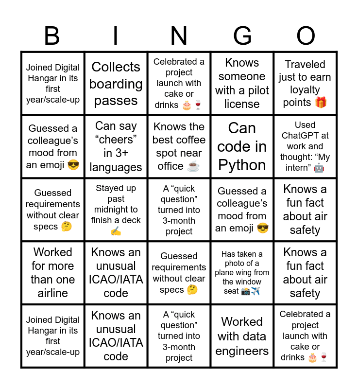 This bingo card has 50 words: Worked for more than one airline, Knows an unusual ICAO/IATA code, Can spot aircraft models in the sky ✈️, Knows someone with a pilot license, Knows a fun fact about air safety, Debugged GA4 events for an airline app, Collects boarding passes, Built a dashboard with 10+ filters, Can code in Python, Contributed to a project beyond Digital Hangar, Joined Digital Hangar in its first year/scale-up, Can say “cheers” in 3+ languages, A “quick question” turned into 3-month project, Worked with data engineers, Used ChatGPT at work and thought: “My intern” 🤖, Tried to explain job to family… gave up 😅, Stayed up past midnight to finish a deck ✍️, Knows the best coffee spot near office ☕, Survived a last-minute meeting invite 📅, Traveled just to earn loyalty points 🎁, Guessed requirements without clear specs 🤔, Joined a call while on vacation 🏖️, Celebrated a project launch with cake or drinks 🎂🍷, Guessed a colleague’s mood from an emoji 😎, Spotted a celebrity at an airport ✈️⭐, Worked for more than one airline, Knows an unusual ICAO/IATA code, Can spot aircraft models in the sky ✈️, Knows someone with a pilot license, Knows a fun fact about air safety, Debugged GA4 events for an airline app, Collects boarding passes, Built a dashboard with 10+ filters, Can code in Python, Contributed to a project beyond Digital Hangar, Joined Digital Hangar in its first year/scale-up, Can say “cheers” in 3+ languages, A “quick question” turned into 3-month project, Worked with data engineers, Used ChatGPT at work and thought: “My intern” 🤖, Tried to explain job to family… gave up 😅, Traveled just to earn loyalty points 🎁, Guessed requirements without clear specs 🤔, Joined a call while on vacation 🏖️, Celebrated a project launch with cake or drinks 🎂🍷, Guessed a colleague’s mood from an emoji 😎, Spotted a celebrity at an airport ✈️⭐, Has rushed to catch a flight but still stopped for coffee ☕✈️, Has taken a photo of a plane wing from the window seat 📸✈️ and Laughed at an aviation or tech meme during work 😂.