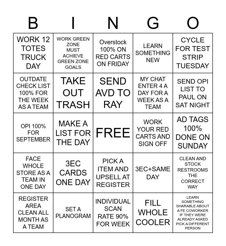 This bingo card has a free space and 24 words: 3EC CARDS ONE DAY, SET A PLANOGRAM, SEND AVD TO RAY, REGISTER AREA CLEAN ALL MONTH AS A TEAM, CYCLE FOR TEST STRIP TUESDAY, WORK 12 TOTES TRUCK DAY, OUTDATE CHECK LIST 100% FOR THE WEEK AS A TEAM, WORK GREEN ZONE MUST ACHIEVE GREEN ZONE GOALS, WORK YOUR RED CARTS AND SIGN OFF, PICK A ITEM AND UPSELL AT REGISTER, MY CHAT ENTER 4 A DAY FOR A WEEK AS A TEAM, OPI 100% FOR SEPTEMBER, 3EC+SAME DAY, CLEAN AND STOCK RESTROOMS THE CORRECT WAY, TAKE OUT TRASH, FILL WHOLE COOLER, AD TAGS 100% DONE ON SUNDAY, Overstock 100% ON RED CARTS ON FRIDAY, SEND OPI LIST TO PAUL ON SAT NIGHT, MAKE A LIST FOR THE DAY, LEARN SOMETHING SHARABLE ABOUT A FE COWORKER IF THEY WERE ALREADY ASKED PICK A DIFFERENT PERSON, FACE WHOLE STORE AS A TEAM IN ONE DAY, LEARN SOMETHING NEW and INDIVIDUAL SCAN RATE 90% FOR WEEK.