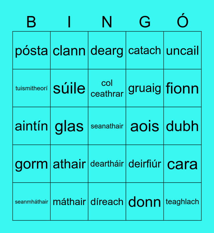 This bingo card has a free space and 24 words: athair, máthair, col ceathrar, seanmháthair, uncail, pósta, tuismitheorí, clann, aois, deartháir, gruaig, aintín, deirfiúr, cara, súile, donn, dubh, dearg, fionn, glas, teaghlach, gorm, catach and díreach.