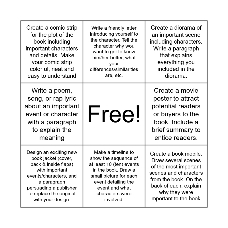 This bingo card has a free space and 8 words: Write a poem, song, or rap lyric about an important event or character with a paragraph to explain the meaning, Write a friendly letter introducing yourself to the character. Tell the character why wou want to get to know him/her better, what your differences/similarities are, etc., Create a movie poster to attract potential readers or buyers to the book. Include a brief summary to entice readers., Design an exciting new book jacket (cover, back & inside flaps) with important events/characters, and a paragraph persuading a publisher to replace the original with your design., Create a diorama of an important scene including characters. Write a paragraph that explains everything you included in the diorama., Create a comic strip for the plot of the book including important characters and details. Make your comic strip colorful, neat and easy to understand, Make a timeline to show the sequence of at least 10 (ten) events in the book. Draw a small picture for each event detailing the event and what characters were involved. and Create a book mobile. Draw several scenes of the most important scenes and characters from the book. On the back of each, explain why they were important to the book..