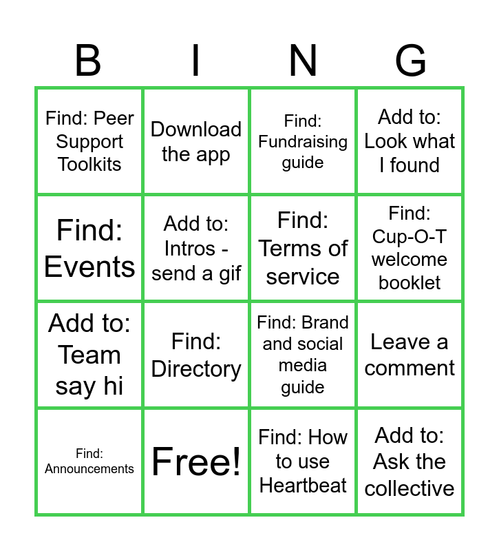 This bingo card has 21 words: Free!, Create your profile, Download the app, Find: Code of conduct, Find: How to use Heartbeat, Find: Terms of service, Find: Peer Support Toolkits, Find: Fundraising guide, Find: Brand and social media guide, Find: Cup-O-T welcome booklet, Add to: Team say hi, Add to: Look what I found, Add to: Ask the collective, Add to: Intros - comment, Add to: Intros - send a gif, Find: Peer Support worker training, Find: Announcements, Find: Directory, Find: Events, Leave a comment and Add to: team suggestions.