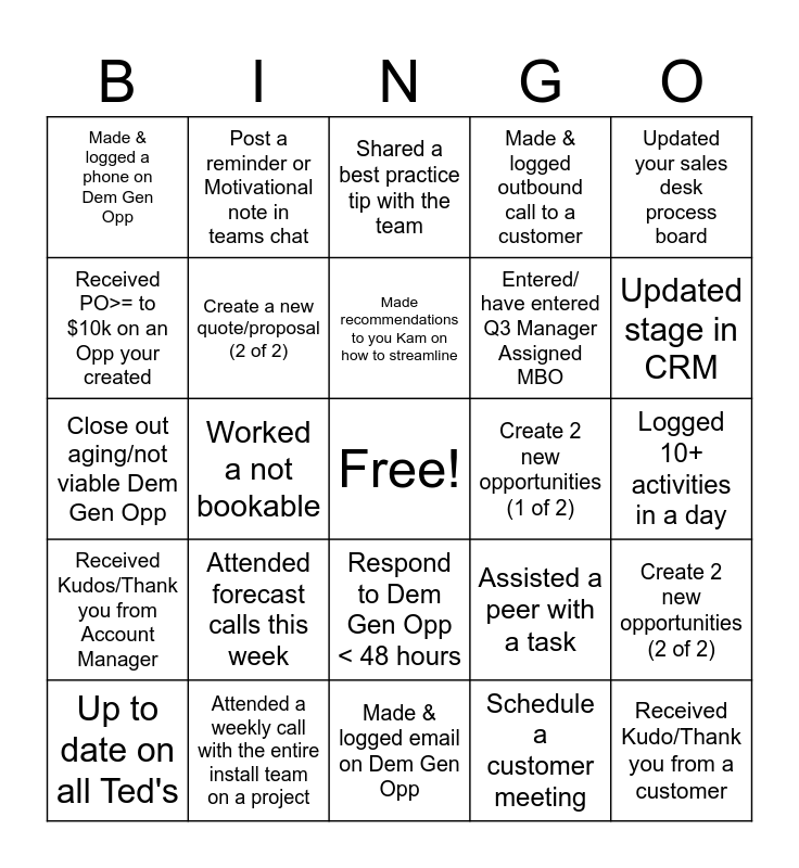 This bingo card has a free space and 24 words: Attended forecast calls this week, Attended a weekly call with the entire install team on a project, Made recommendations to you Kam on how to streamline, Up to date on all Ted's, Updated your sales desk process board, Made & logged a phone on Dem Gen Opp, Received PO>= to $10k on an Opp your created, Post a reminder or Motivational note in teams chat, Create 2 new opportunities (1 of 2), Respond to Dem Gen Opp < 48 hours, Entered/ have entered Q3 Manager Assigned MBO, Close out aging/not viable Dem Gen Opp, Assisted a peer with a task, Create 2 new opportunities (2 of 2), Create a new quote/proposal (2 of 2), Schedule a customer meeting, Logged 10+ activities in a day, Shared a best practice tip with the team, Updated stage in CRM, Worked a not bookable, Received Kudo/Thank you from a customer, Received Kudos/Thank you from Account Manager, Made & logged outbound call to a customer and Made & logged email on Dem Gen Opp.