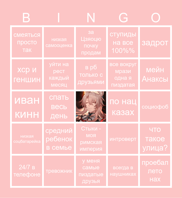 This bingo card has a free space and 24 words: 24/7 в телефоне, средний ребенок в семье, в рб только с друзьями, всегда в наушниках, задрот, смеяться просто так, низкая самооценка, за Цзяоцю почку продам, по нац казах, социофоб, иван кинн, уйти на рест каждый месяц, интроверт, что такое улица?, хср и геншин, тревожник, у меня самые пиздатые друзья, ступиды на все 100%%, мейн Анаксы, низкая соцбатарейка, спать весь день, Стыки - моя римская империя, все вокруг мрази одна я пиздатая and проебал лето нах.