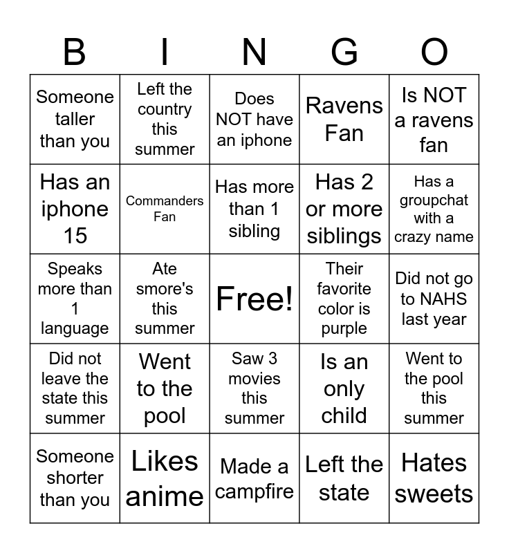 This bingo card has a free space and 24 words: Went to the pool, Likes anime, Has more than 1 sibling, Someone shorter than you, Is NOT a ravens fan, Someone taller than you, Has an iphone 15, Left the country this summer, Their favorite color is purple, Saw 3 movies this summer, Has 2 or more siblings, Speaks more than 1 language, Is an only child, Went to the pool this summer, Commanders Fan, Left the state, Did not go to NAHS last year, Does NOT have an iphone, Has a groupchat with a crazy name, Ate smore's this summer, Hates sweets, Did not leave the state this summer, Ravens Fan and Made a campfire.