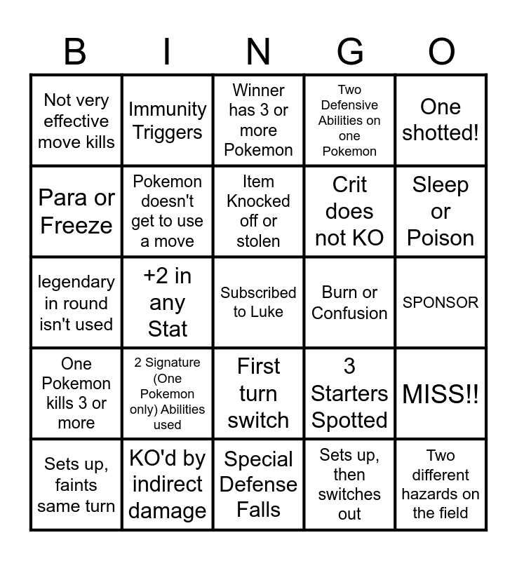 This bingo card has a free space and 24 words: 2 Signature (One Pokemon only) Abilities used, KO'd by indirect damage, Item Knocked off or stolen, Sets up, faints same turn, One shotted!, Not very effective move kills, Para or Freeze, Immunity Triggers, Burn or Confusion, First turn switch, Crit does not KO, legendary in round isn't used, 3 Starters Spotted, MISS!!, Pokemon doesn't get to use a move, Sets up, then switches out, SPONSOR, Winner has 3 or more Pokemon, Sleep or Poison, +2 in any Stat, Two different hazards on the field, One Pokemon kills 3 or more, Two Defensive Abilities on one Pokemon and Special Defense Falls.