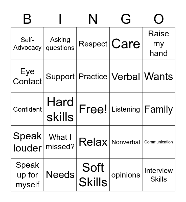 This bingo card has a free space and 24 words: What I missed?, Needs, Practice, Speak up for myself, Raise my hand, Self-Advocacy, Eye Contact, Asking questions, Listening, Relax, Verbal, Confident, Nonverbal, Communication, Support, opinions, Family, Respect, Wants, Hard skills, Interview Skills, Speak louder, Care and Soft Skills.