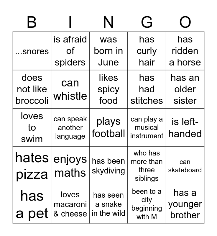 This bingo card has 25 words: enjoys maths, has seen a snake in the wild, likes spicy food, has a pet, has ridden a horse, ...snores, does not like broccoli, is afraid of spiders, can play a musical instrument, has been skydiving, has had stitches, loves to swim, who has more than three siblings, can skateboard, can whistle, has a younger brother, is left-handed, was born in June, has an older sister, can speak another language, plays football, loves macaroni & cheese, hates pizza, has curly hair and been to a city beginning with M.